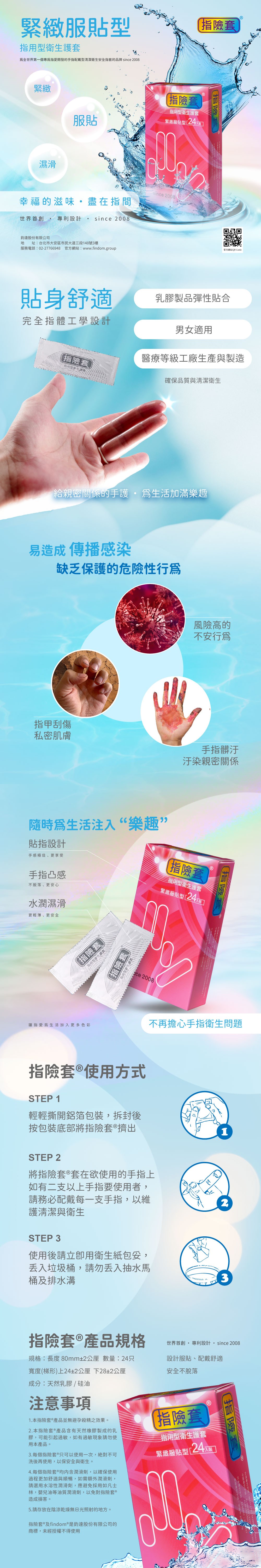•每個指險套均內含潤滑劑, 以確保使用過程更加舒適與順暢, 如需額外潤滑劑, 請選用 水溶性潤滑劑, 應避免採用凡士林, 嬰兒油等油質潤滑劑, 以免對指險套®造成傷害
